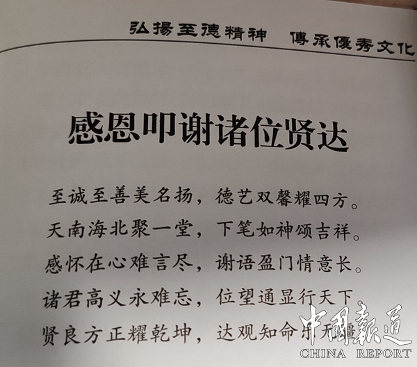以弘揚至德精神傅承優秀文化为主旋律的《至至德天下》创刊号117页 《感恩叩谢诸位贤达》也是一首藏头诗。“至诚至善美名扬,德艺双馨耀四方。天南海北聚一堂,下笔如神颂吉祥。感怀在心难言尽,谢语盈门情意长。诸君高义永难忘,位望通显行天下。贤良方正耀乾坤,达观知命乐无疆。”