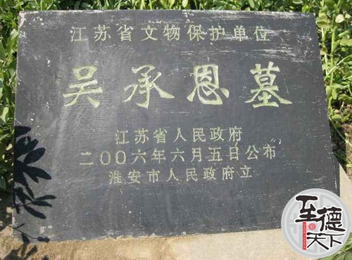 墓址 吴承恩墓位于淮安城东南的马甸乡二堡村,在大运河东堤东的南干渠东边。墓园呈方形,占地面积约2000平方米。墓前竖有1.5米高的石碑,上刻有阴文“荆府纪善吴公承恩之墓”10个字。墓南10米有4柱3门带脊檐的牌坊一座。柱高8米,横坊书有楷书“吴承恩之墓”五字,1974年12月,吴承恩及其父吴锐之墓同时被盗。1981年8月,淮安市人民政府找到吴承恩的墓地,并建为吴承恩墓园。1987年9月,吴承恩墓被淮阴市人民政府公布为文物保护单位。