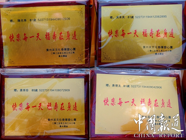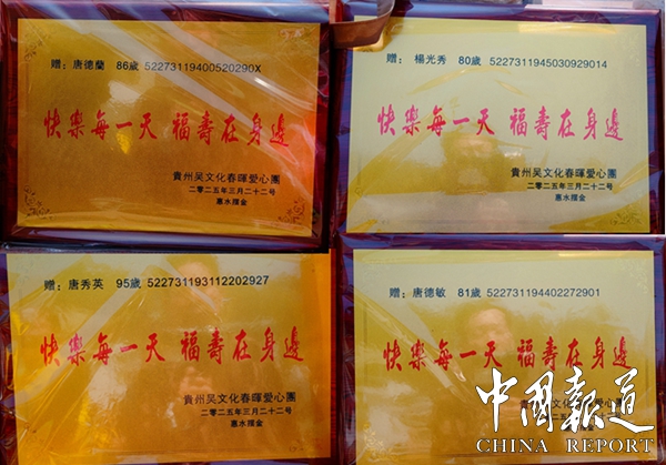 在温馨热烈的氛围中,一份份爱心被颁送到村寨里的老寿星手中,包括唐秀英(95岁)、唐秀珍(85岁)、唐德敏(81岁)、唐德秀(86岁)、唐德籣(86岁)、吴承英(81岁)、唐德友(81岁)、陈光秀(81岁)、杨光秀(80岁)等老人。这些寿星牌匾和满载爱心的被褥、袜子,给予了老人们物质与心灵的双重慰藉。老人们接过这份特别的关怀,脸上洋溢着幸福的笑容,那是岁月沉淀后的满足与喜悦。