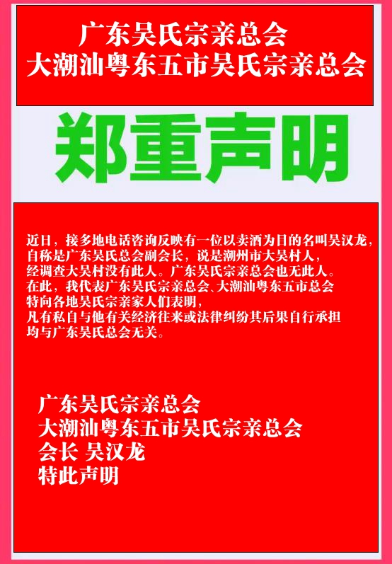 广东吴氏宗亲总会大潮汕粤东五市吴氏宗亲总会郑重声明