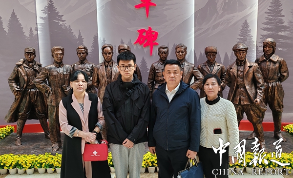 近日,刚考研成功后的吴显,为了爷爷的吴义和生前心愿,随父亲吴武胜、母亲钟暇,在姑姑吴白雪的陪同下踏遍千山万水车程约3395公里,从湖北省咸宁来到新疆乌鲁木齐革命烈士园,终于找到了曾祖父吴茂林的墓碑,在吴茂林的墓碑前全家行跪拜之礼,敬香上家乡茶叶,花生米,肉包苹果等贡品时。正巧来自乌鲁木齐市的中学生数百名在解说员的介绍下逐一缅怀烈士场景令吴显全家人倍感亲切和温馨。自己祖父在九泉之下时常有人来祭奠感到万分荣幸。在烈士陵园展览馆,在烈士群塑像前,在吴茂林塑像前,吴显仅与曾祖父像貌极度相似,可见基因之强大令人震惊。