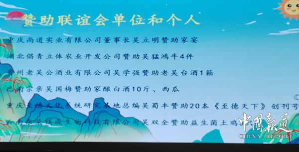本次联谊会得到以下企业鼎力支持,重庆尚道实业有限公司董事长、巴南吴氏联谊会会长吴立明赞助晚宴,湖北侣青立体农业开发公司赞助吴猛鸡牛4件,贵吴总会会长、老吴台集团董事长吴学强赞助老吴台酱香酒1箱,巴南吴国梅赞助家酿白酒10斤、西瓜等水果,天下吴氏网、至德天下网创始人、重庆至德文化系统研究基地主任吴蜀丰代表基地赠送《至德天下》创刊号20本。云南乐荣钱成生物科技有限公司董事长吴双全赞助益生菌生态土鸡。