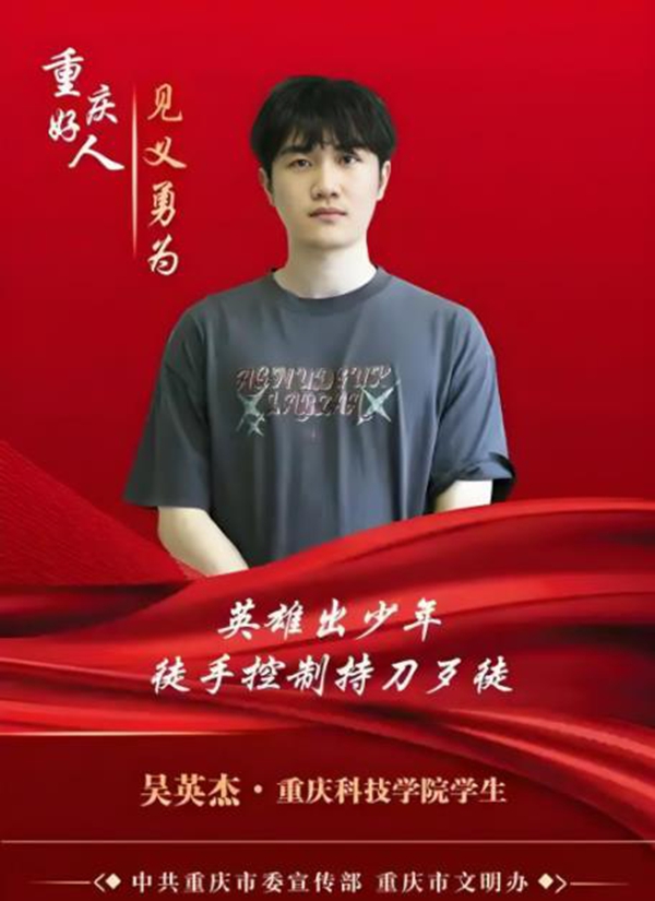 突出吴英杰(2001年9月出生),男,汉族,老家新疆乌鲁木齐,重庆科技大学机械电子工程专业2020级3班学生。2023年3月19日,在重庆轨道交通1号线列车上制止犯罪嫌疑人何某某行凶,保护了多名乘客生命安全,被中央政法委评为全国"见义勇为"勇士。2024年2月获评"2023年度感动重庆十大人物" ,同年6月毕业后入职重庆赛力斯集团金康动力公司 。其事迹入选2024年全国道德模范候选人名单 。