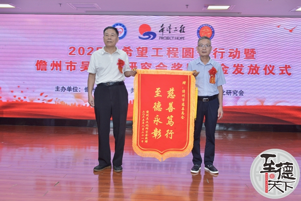 儋州市慈善总会羊垂儒副秘书长,儋州市吴文化研究会吴锦波会长,分别颁发慈善奖牌和赠送锦旗。颁奖典礼最后,儋州市吴文化研究会吴锦波会长作总结发言。在讲话中指出,首先要感谢我们伟大的祖国,在党的正确领导下,才有今天的安宁生活。青年是文化传承与创新的核心力量,研究会持续以奖助学金为纽带,与慈善总会,团市委,市关下代工委联合搭建这一个平台。通过奖励`助困,把社会各界和父老乡亲的关心关爱,转化为成长的动力,期待同学们学好知识,掌握本领,增长新才干,以优异成绩回报家乡,守护爱心的根脉,让乐于奉献的心灵和品德,在新时代、海南自贸港建设焕发新活力。