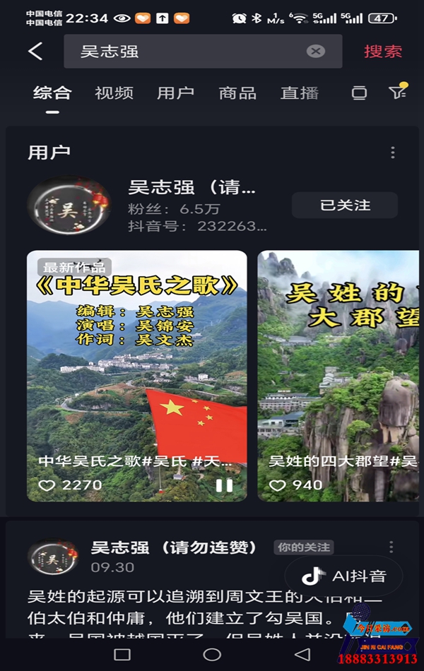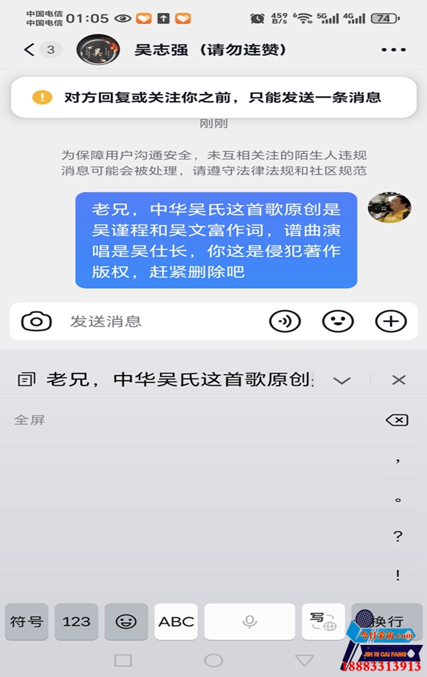 吴仕长认为,我吴氏一族,向来以至德谦让为家传之本,而今众多宗亲踊跃弘扬吴门精神、传续氏族文化,本是令人欣慰之事。然近日发觉,竟有人盗用他人作品,冒名顶替,以不正之手段违规宣传,实在令人痛心。《中华吴氏》一曲,由文富主席与谨程秘书长共撰歌词,由吾亲自谱曲并演唱,此乃确凿无疑。今有吴志强、吴文杰、吴志安三人,公然冒用此作,欺世盗名,不仅侵犯权益,更辱没我吴氏门风。在此,吾愿以文字为凭,以事实为据,敦促三位出面澄清,给天下吴姓一个坦诚的交代。文人立世,重风骨、讲性情;既不愿无端指摘,也绝不纵容蒙昧之行。望诸君自重,亦望公道自在人心。