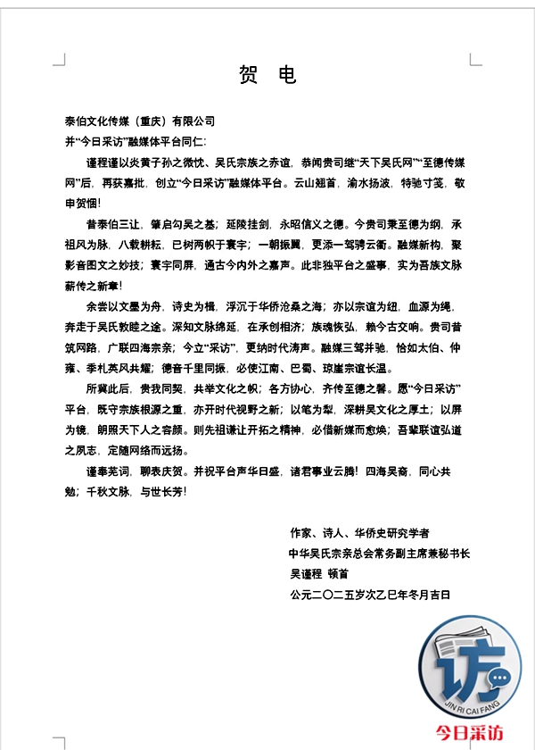 关于我们】今日采访.com、天下吴氏网、至德传媒网隶属于泰伯文化传媒(重庆)有限公司独家运营的三网合一公益性网站,集官网、APP、自媒体、抖音、视频号、公众号同步传播的综合性融媒体平台。