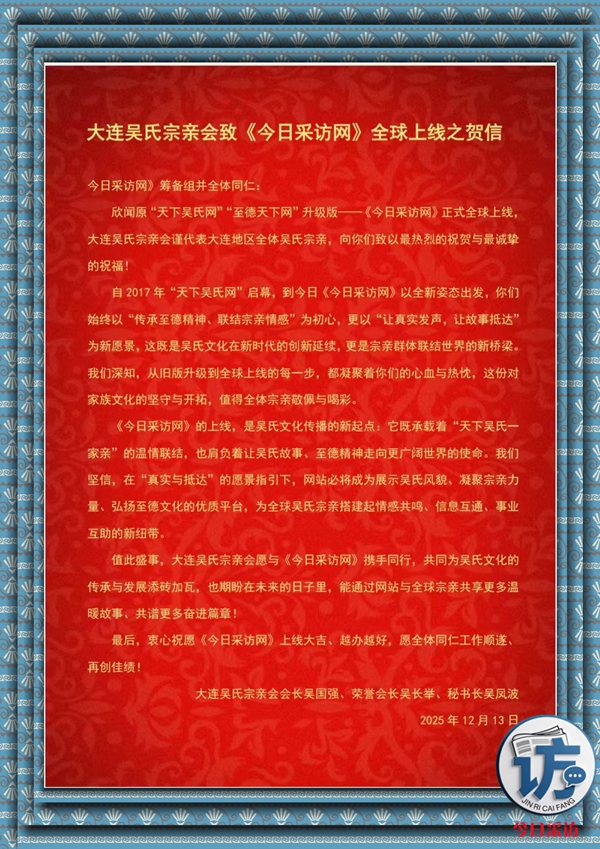 大连吴氏宗亲会致《今日采访网》全球上线之贺信