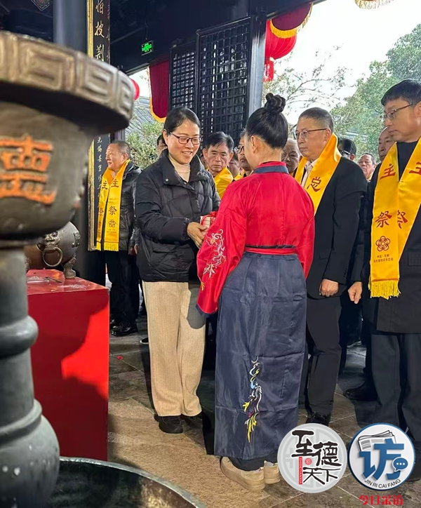 吴新会长在至德殿宣读祭文,追溯泰伯公“三让王位”高风,颂扬开发江南、教化万民伟业,宣示传承至德文化、凝聚宗亲力量的决心。祭文毕,全体再行三鞠躬,神情庄重,心怀敬仰。为传承地方历史与至德文化,祭文诵读结束后,由泰伯书院执行院长高华将自己主编的《梅里史话》一书,郑重赠予梅村实验小学,以史育人、以文化人,助力青少年更好地了解祖地历史、传承先贤精神。