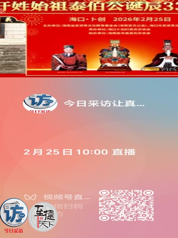 其二,今日上午10点,海南吴贤秀文化教育基金会海南吴氏公会海南口市吴贤秀文化研究会联合在海口卜村吴氏宗亲会举办泰伯公诞辰3310周年祭祀大典,来自海南各地区约1500余名吴姓代表参加,今日采访网海南自贸区总站将全程直播本次活动。