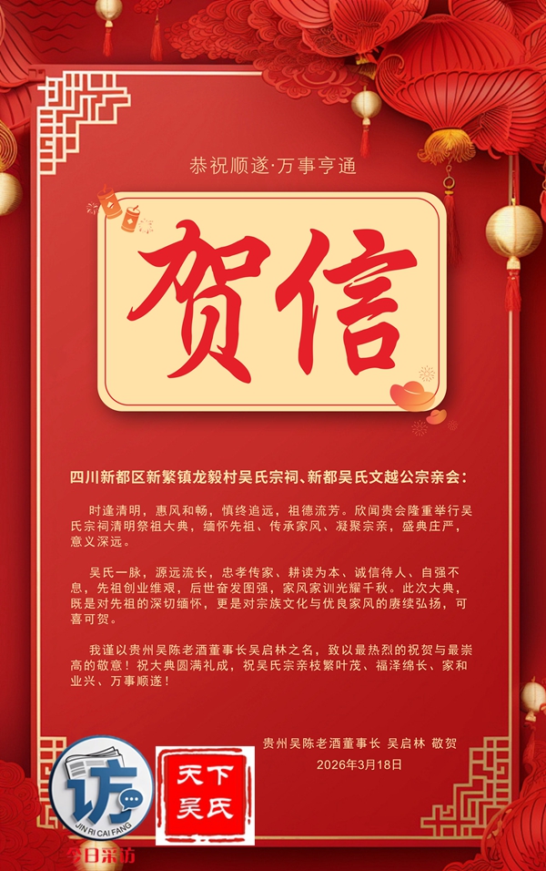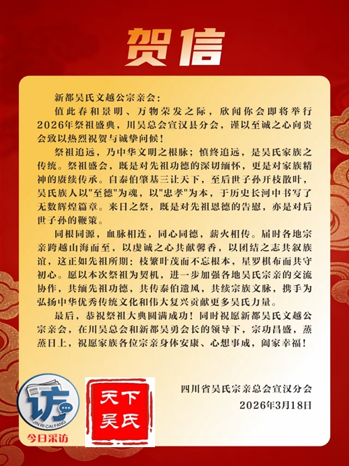 欣闻四川新都吴氏文越公宗亲会清明祭祖大典即将举行,谨致最诚挚的祝贺!慎终追远,民德归厚。此次大典,宗亲们齐聚一堂,缅怀文越公之功德,传承吴氏家族之文脉,尽显尊祖敬宗、敦亲睦族的深厚情怀。这不仅是对先祖的深切追思,更是家族凝聚力的生动彰显。愿吴氏宗亲以此次大典为契机,赓续家族优良传统,携手共进,再创家族辉煌!3月22日上午,今日采访网将向全球直播祭祖大典。