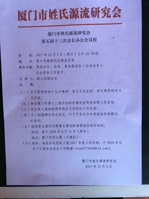 厦门姓氏源流研究会第五届十三次会长办公会由施氏宗亲会主办,厦门市社科联陈怀群主席,袁安处长及厦门十四个宗亲会领导参加,施氏宗亲特邀吴氏宗亲代表吴国荣、吴金魁、吴同一、吴长青、吴冬青参会。施氏宗亲带着所有与会人员参观了深沪湾畔的施琅将军雕像、靖海侯府、衙口施氏大宗祠、施琅广场,让大家对这位将军的丰功伟绩有了进一步了解,作为施琅将军的副将吴英以及施琅吴英共同的宗祠---将军祠的再造再一次被提上议程。