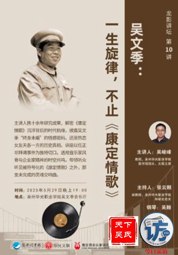吴文季(1918年3月31日—1966年5月1日),福建省惠安县洛阳镇人,毕业于南京国立音乐学院,中国音乐家。1947年采集西康地区民歌《跑马溜溜的山上》,改编为《康定情歌》,该作品后入选美国太空局“世界最具代表性的十首歌曲”及联合国教科文组织“世界十首最具影响力的民歌”。1952年领唱《英雄们战胜大渡河》,晚年创作《丰收之夜》等惠安题材作品。