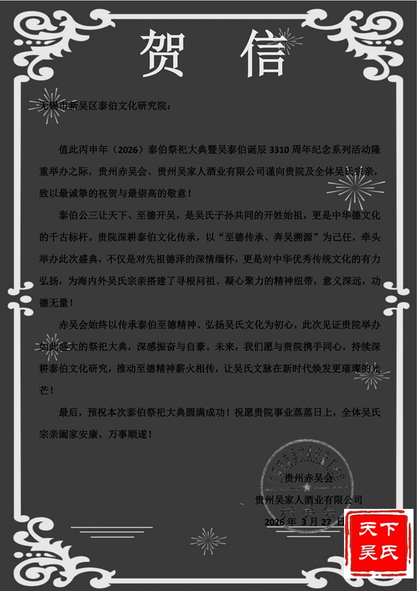 值此丙申年(2026)泰伯祭祀大典暨吴泰伯诞辰3310周年纪念系列活动隆重举办之际,贵州赤吴会,贵州吴家人酒业有限公司谨向贵院及全体吴氏宗亲,致以最诚挚的祝贺与最崇高的敬意!