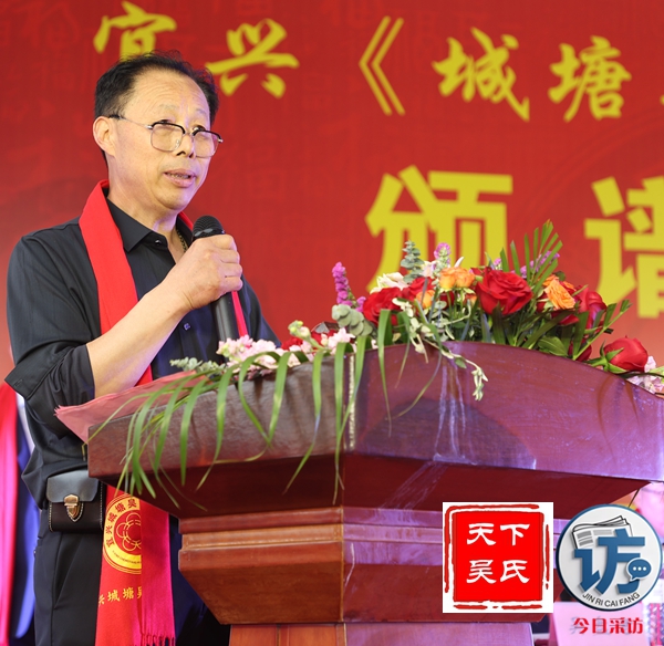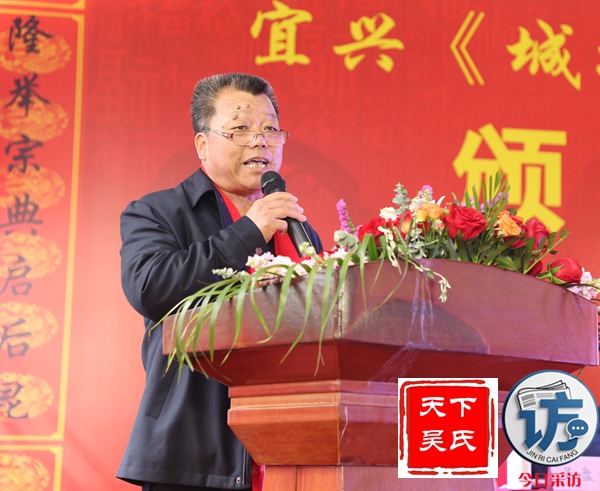 宜兴市吴氏文化研究会会长吴玉明在致词中说,时值清明,慎终追远,我们欢聚一堂,共同迎来宜兴城塘吴氏颁谱盛典。在此,我谨代表宜兴市吴氏文化研究会,对本次颁谱盛典表示热烈的祝贺!向出席典礼的各位来宾、各位嘉宾及各位吴氏宗亲,致以最诚挚的问候和美好的祝愿!