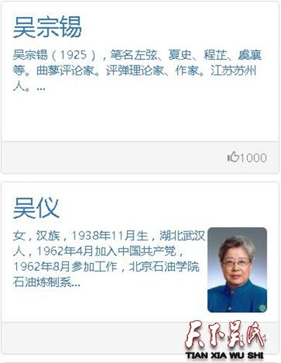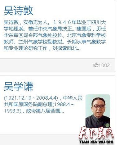 吴姓现代人物:吴邦国、吴伯雄、吴墩义﹑吴官正、吴学谦、吴桂贤﹑吴仪、吴基传、吴胜利、吴健雄等。