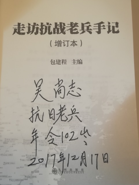 与吴尚志宗长一起合影的抗战老兵潘庭槐先生,是温州瓯海人,七七事变发生时,潘庭槐先生还在温州瓯海中学读初中,之后加入宪兵队。8月15日,日本天皇宣布投降时,南京一带还有几万名日本人驻守,手里都有武器。潘庭愧奉命率敢死队坐飞机到南京,进了南京城,潘庭槐见到日本兵都围在一起,枪支整齐地叠放在一边,才确认日本是真投降了。之后,潘庭愧先生参加了南京受降仪式的安保工作。1946年,潘庭愧还参加过国共重庆谈判的安保工作,并且在重庆亲眼见过毛泽东。
