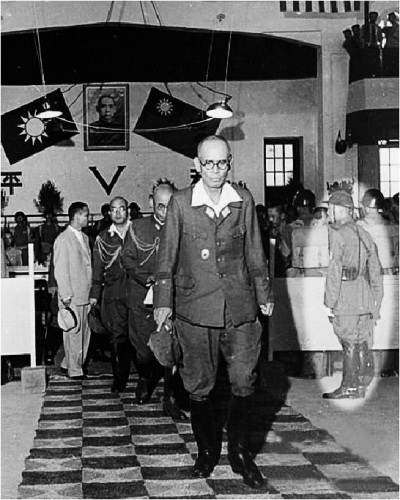 在南京受降仪式上,日本中国派遣军总司令官冈村宁村右后方的宪兵 即是潘庭愧先生