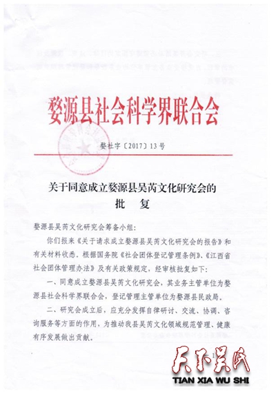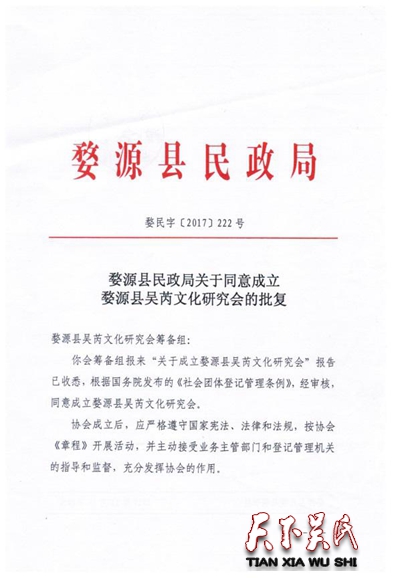 江西吴氏文史研究会、江西省吴氏宗亲总会将婺源成立宗亲会作为2017年的工作重点之一,并派出得力人员前往婺源指导、督促、沟通、协助。在筹备过程中,多次向县委、政府的主要领导汇报,并取得支持。在婺源发生、根瑞、福林、尚钦、瑞林、华生、玄福、志红等宗亲的积极、主动、热心工作和配合下,终于完成了各项筹备工作。值得称赞的是,会长吴福林多次奔走于县政府各部门之间,短短的十天内,完成了各种审批手续和刻章、建账号等事项。这种办事效率,在国内宗亲活动中是少有的。