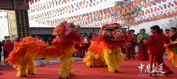 冬日温暖的阳光普照玉皇宫,嘉宾云集,人山人海,锣鼓喧天,龙狮表演令活动现场热闹非凡,一片祥和气象。