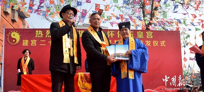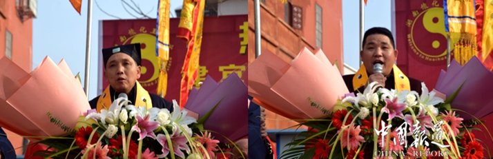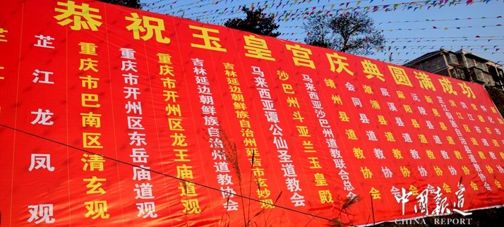 冬日温暖的阳光普照玉皇宫,嘉宾云集,人山人海,锣鼓喧天,龙狮表演令活动现场热闹非凡,一片祥和气象。