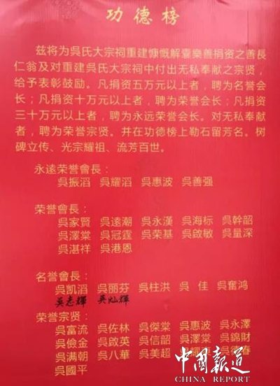 2014年提出要重建吴氏大宗祠,迅速得到同乡人的支持,大家出钱出力。据统计,超6000多人自掏腰包重建吴氏大宗祠,有的远嫁外地的姑娘还特意回乡捐出一己绵薄之力。