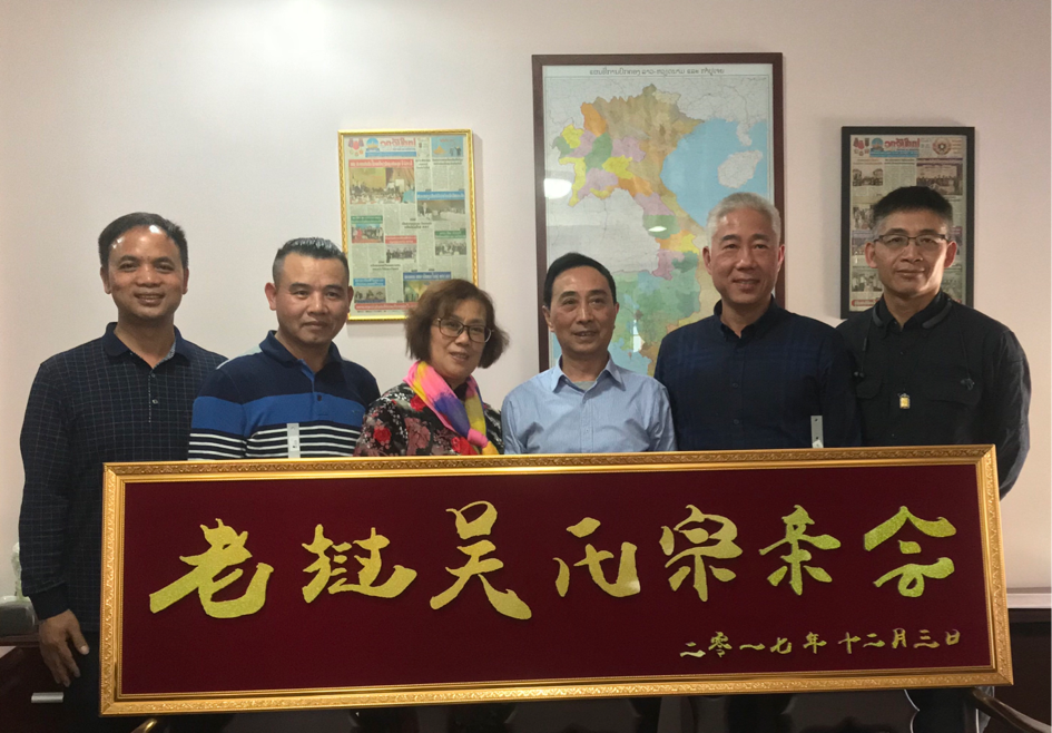 老挝吴氏宗亲会12月23日万象讯 应宗亲会邀请,著名书画家吴俊伯携夫人在吴国庭秘书长陪同下莅临老挝看望吴氏宗亲。吴艾伦会长率领各位副会长迎接并设宴款待,汇报在老宗亲简况及老挝国情。表示老挝虽小,但机遇较多,希望俊伯大师夫妇多走走看看,借助大师威望,多宣传和推动中老友好特别是文化领域的交往与合作。
