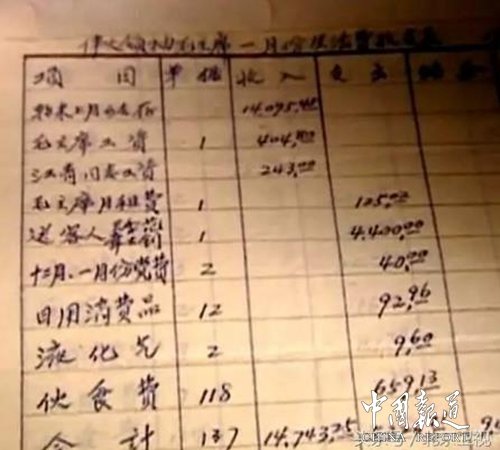 韶山纪念馆现保存毛泽东生活费收支表11份,日常杂费开支账本4本,粮食账本2本,物品分类账2本。换句话说,这堆账本足以体现当年中国第一家庭的几乎整个财务与生活状况,红墙高耸的中南海里,曾经为亿万普通人仰望的开国领袖,在这一笔笔账目中,还原成了普普通通的一家之主的身份,衣食住行、油盐柴米量。毛泽东究竟是怎么挣钱,花钱的呢?最有发言权的,当然是负责记账的人,这个人叫吴连登。吴连登说:“前后一共12年时间,从1964年到1976年,毛主席家的帐说好管也好管,说难管也很难,难在什么地方呢?没有钱。”