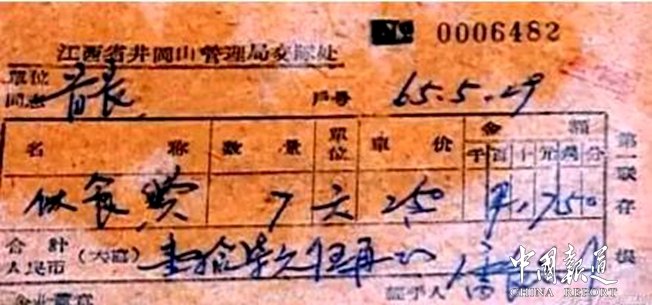 1965年5月22日,离开35年的毛泽东重返井冈山,毛主席是1965年5月22日下午5点左右到的,28日上午9点多离开。前后7天。这位连喝茶都要交钱的领袖,再这短短7天内,一样的公私分明。收藏在韶山纪念馆的这两张发票,足以证明毛泽东那几近严苛的公私分明,这是1965年他重游井冈山后,由井冈山交际处开具的发票。上面的是首长伙食费7天,每天2.5元,合计17.50元。另一张是首长交粮票23斤。
