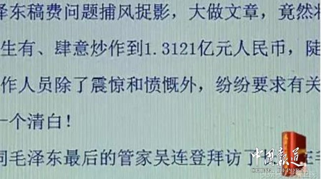吴连登说:“社会上有人造谣!说毛主席的稿费有1亿三千1百万。我从好几个杂志上面看到过,我当时看到后心里很不舒服,我就找当年管毛主席稿费的郑长秋,又找汪东兴、又找张耀祠、又找张玉凤、找吴旭君等,找了很多人。我说,人家造谣,我们有必要出来澄清。如果我们这些人再不讲,那白的都让他都说成黑的了!”这一点毛泽东的账目足以证实,他的稿费清单即明确记载,1959年底结存款248689.3元,所谓五十年代即达百万稿费之说,显然不实。毛泽东的稿费总额究竟有多少?他又是怎么对待这些稿费的呢?毛主席临终的时候,稿费是124万多一点,用在家庭的也只是几万块钱,有些送民主人士,主席的稿费没有做为遗产留给自己的子女,而是把这些钱归党,归人民了。