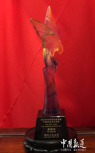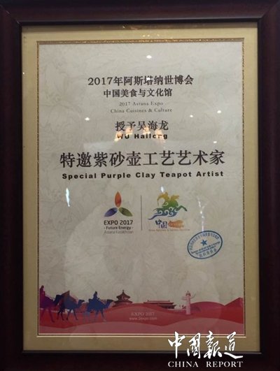 中国报道讯(记者吴蜀丰)最近几天连日来,各大网相继报道第五代紫砂壶传承人吴海龙大师在上海世博中心领取了“2017年阿斯塔纳世博会中国美食与文化馆紫砂工艺金奖”。虽不懂紫砂文化,但能够把紫砂工艺带出国门走向世界,这是件了不起的事情。怀着一颗敬仰之心,我走进了吴海龙大师去了解他,了解紫砂文化。