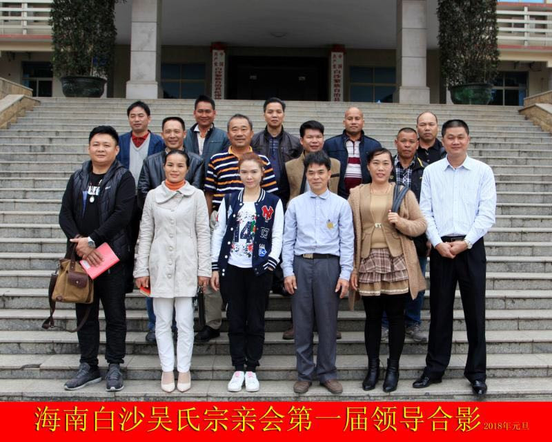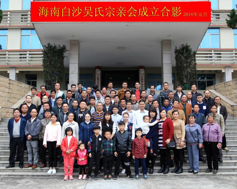 2018年1月1日,海南白沙吴氏宗亲联谊会成立成立大会在在海南省白沙黎族自治县同庆酒店召开,一百多名白沙县的宗亲会代表,参加了成立大会。会议通过全体宗亲选举产生了海南白沙吴氏宗亲联谊会第一届领导机构。吴伟富当选为会长、吴劲文、吴永全、吴福天、吴儒成当选为常务副会长、吴选助、吴儒欢、吴昌恒、吴文荣、吴亚韩、吴亚茅当选为副会长、吴杰、吴苗当选为秘书长、吴若峰、吴永南当选为监事长、吴美金为会计、吴玉莹为出纳。