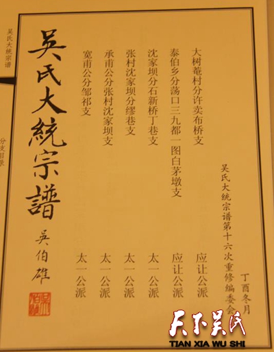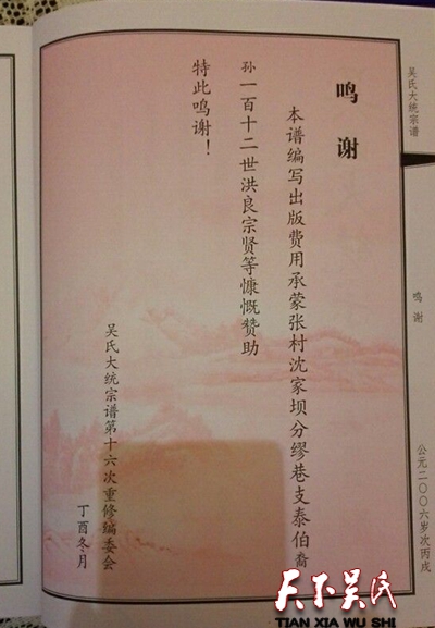 今天,在东北塘吴氏宗谱玉成弘发之际,大家闻着崭新的宗谱所散发出的沁人心脾的油墨清香,望着宗谱续接载入的吴氏子孙名录,读着宗谱所记载的吴氏先祖的丰功伟绩,内心充满着满腔的喜悦。这种喜悦,是来自大家付出艰辛劳动而获得丰硕成果后的一种心田滋润,是可以让子孙后代共享吴氏文化精髓的一种心音相传。