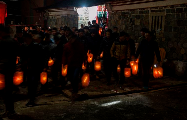人们提着写有郡号的红灯笼绕祖祠三圈