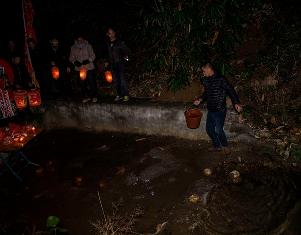 家家户户的男姓代表提着写有郡号、点着焟烛的红灯笼,前往指定的地方进行”请水“仪式