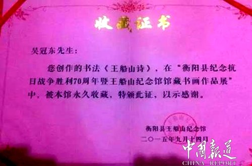 吴冠东是的。不仅是义工协会的,只要是我知道的任何社会团体组织的慈善拍卖,我都会毫不犹豫地送去我的精品力作。自从我进入书画圈以来,只要我参与的活动,基本上都获得了一定的荣誉和奖赏。承蒙各界朋友的抬爱,目前,我已经被聘请为“船山润物书画社”副社长、“大海书画院”副院长以及“香港宅妆设计师事务所”和“素文化装饰设计工程公司”特聘的书法顾记者,作品除被众多藏家和爱好者收购外,还被《衡阳保卫战纪念馆》《王船山纪念馆》以及长沙的《黄兴纪念馆》等永久性收藏。