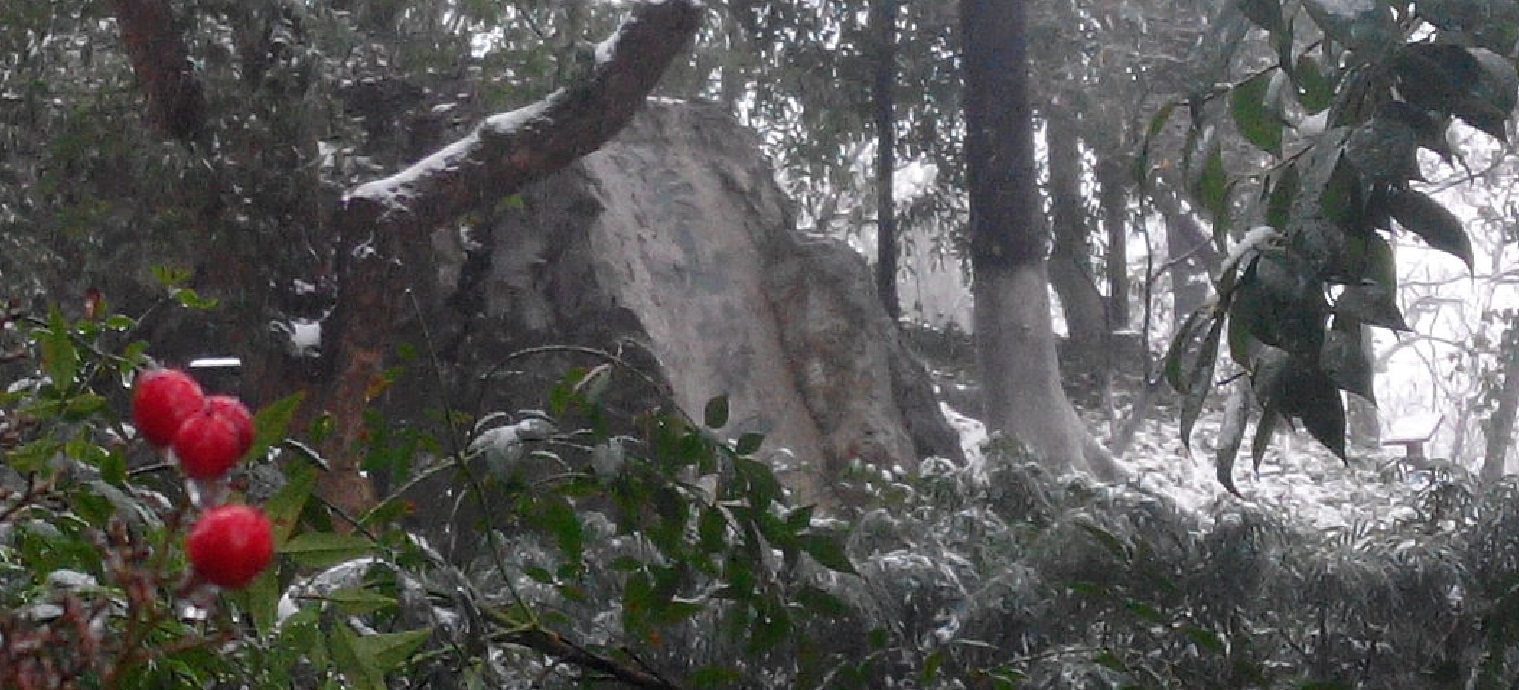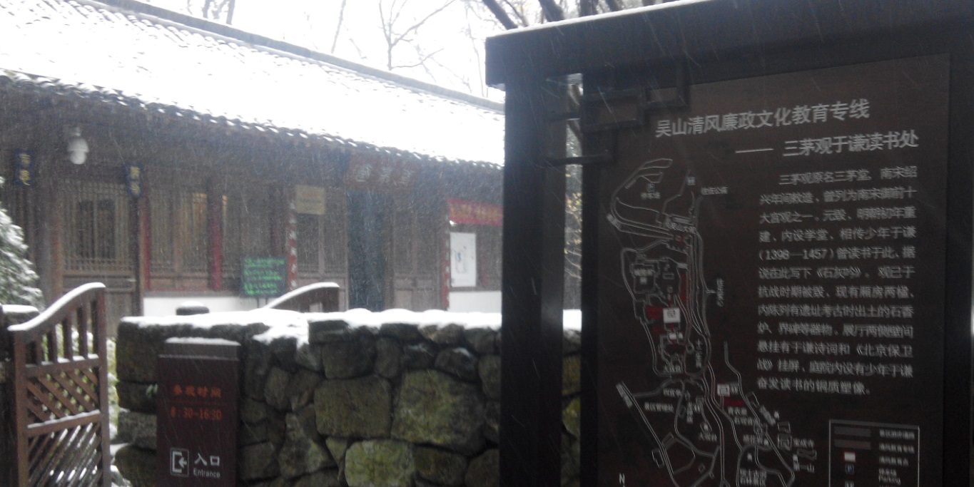 离开城隍阁,继续向山里面走,沿途欣赏路边的高大的古树,雪中盛开的鲜花,以及雪景。在经过三茅观旧址时,看到旁边的牌子上介绍这是于谦读书处。这位于谦不是郭德纲的搭档、相声学员于谦,而是明朝的兵部尚书。