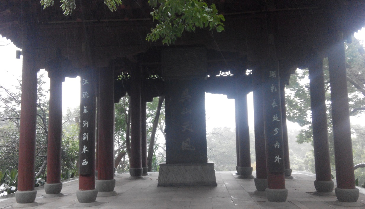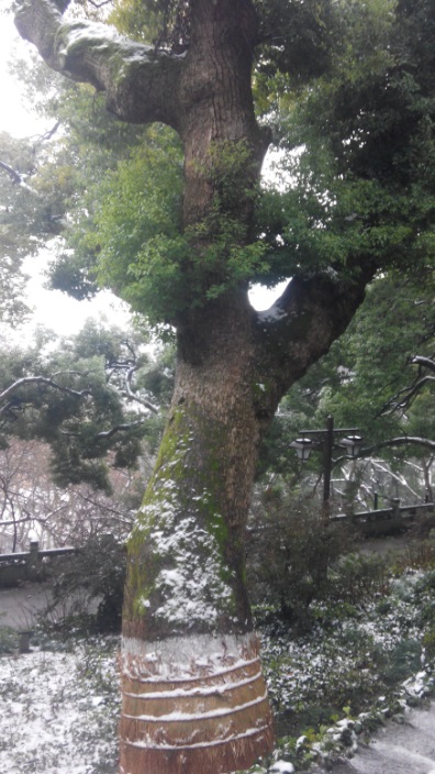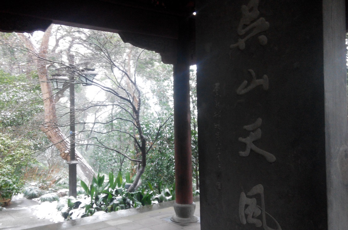 到了吴山,看到吴山广场因为要修建吴山广场地铁站,而被围起来了,正在破土施工,于是就去山下的杭州博物馆参观一下,之后沿山道而上,来到城隍阁。城隍阁很高大,旁边是吴山天风的碑亭,“吴山天风”这四个字是浙江湖州的书法家费新我在八十二岁时用左手写的。由于上山时雪下得正大,所以在城隍阁之上,向四周看,能见度不高,看不到西湖,只看到绿色的山峦和没有摩天大楼的街区的屋顶上覆有白雪。由于下雪,城隍阁上的游人不多,不过在我刚离开城隍阁时,来了一群日本游客,说着日语,上了城隍阁。