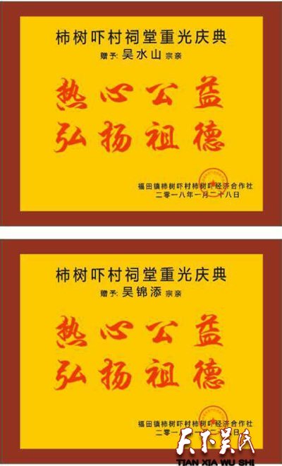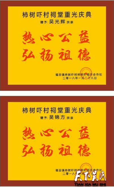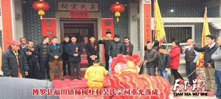 天下吴氏网讯(特约采编吴昌禄)2018年1月28日,广东惠州博罗县福田镇柿树吓吴氏宗祠落成重光志庆,珠三角吴氏宗亲总会组团参加庆贺。柿树吓吴氏宗祠历史悠久,由于年久失修,广大吴氏宗亲纷纷建议重建宗祠。在此背景下,福田镇柿树吓村长吴光辉牵头组织下,成立筹建委员会,发动广大宗亲集资捐款。于2017年中秋后兴建,2018年1月落成重光,历时八个多月,投入资金九十多万元。