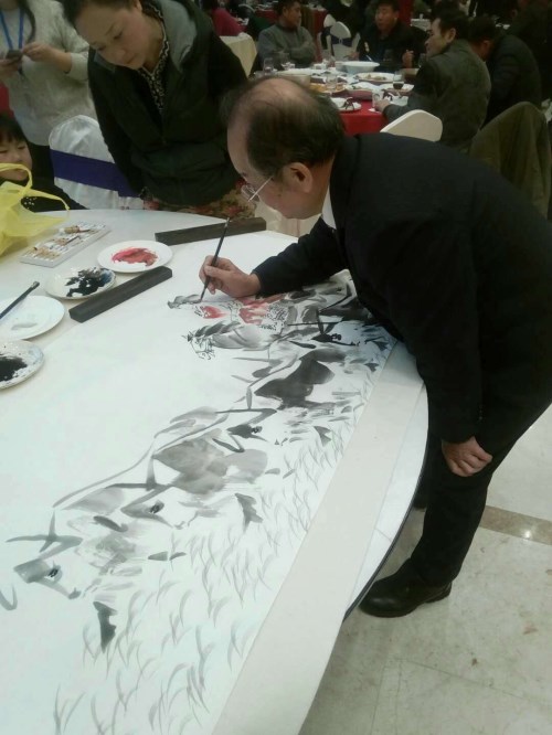 在中华清风书画协会江阴分会挂牌仪式结束后,艺术家们即兴挥毫,留下纪念作品。吴卫祖先生写下"清风徐来,百花盛开"和"正德臻善"两个六尺对半横幅。