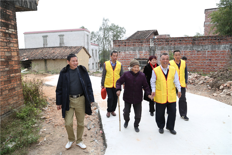 正当宗亲们往钟秀连寿星家中赶的时候,却在村中路上碰着了老寿星,只见她在村中的小道上悠悠散着步,见到宗亲们一伙人来看望她,十分开心。今年刚好一百周岁的钟秀连,除了耳背之外,身体康健,精神状态非常好。来到她的家中,大家与老人亲切交谈,关切询问老人的饮食、生活情况。得知老人早睡早起,生活能自理,宗亲们非常高兴,并嘱咐老人的家属,要注意老人的营养、防止摔跤,照顾好老人的生活,并祝老人健康长寿。