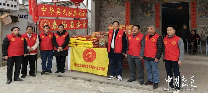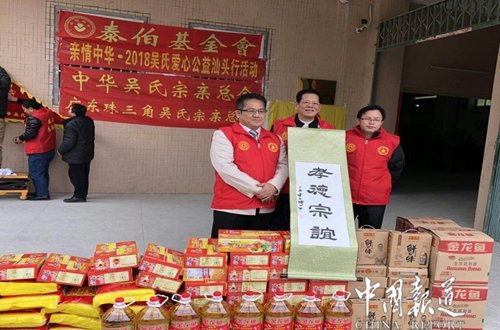 中国报道讯(记者吴蜀丰特约采编 吴谨程 吴昌禄)在春节即将来临之际(2月7日),为了搞好春节期间对吴氏孤寡老人及贫困家庭户的走访慰问工作,及时将“亲情中华”的爱心送达到户,确保让他们过个温暖、祥和的节日,由香港泰伯基金会、中华吴氏宗亲总会、珠三角吴氏宗亲总会、中华吴氏粤东分会(筹)联合发起主题为《亲情中华·2018吴氏爱心公益行》活动在汕头正式开展。