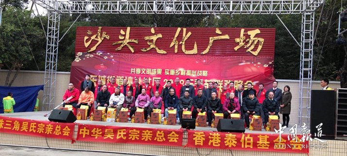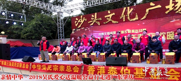 中国报道讯(记者吴蜀丰特约采编 吴昌禄)在春节即将来临之际,2018年2月9日,广东珠三角吴氏宗亲总会、香港泰伯基金会、中华吴氏宗亲总会、广东珠三角顺德乐从水藤吴氏宗亲联谊会、肇庆市四会东城街道沙头社区在广东珠三角肇庆市四会东城街道沙头社区共同发起第二轮主题为《亲情中华·2018吴氏爱心公益行》暨2018春节联欢晚会活动,给他们送上亲情关怀和祝福。