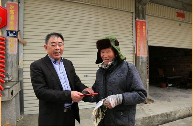 图为尾厝村党支部书记吴渊全代表本会慰问该村吴氏老人。