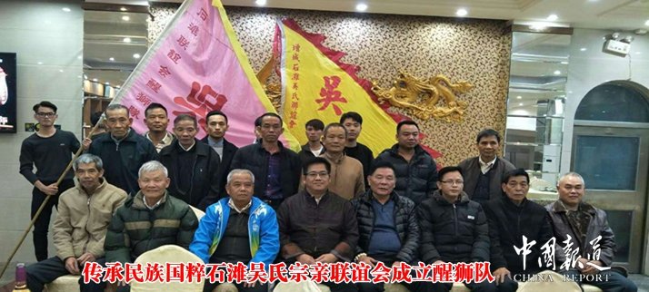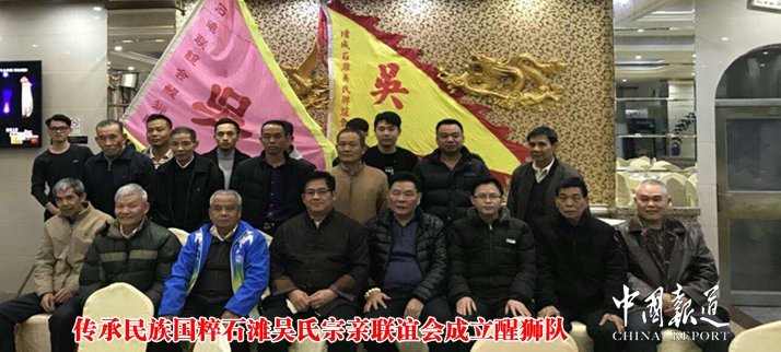 中国报道讯(记者吴蜀丰 特约采编吴昌禄)为了更好传承中华民族国粹文化,弘扬民族优秀文化精神,2017年2月22日(农历正月初七),在广东珠三角吴氏宗亲总会执行会长、增城区石滩吴氏宗亲联谊会会长吴萧麟等宗亲的倡议和组织下,广州市增城石滩吴氏宗亲联谊会醒狮队在增城区石滩镇海景酒楼正式成立。