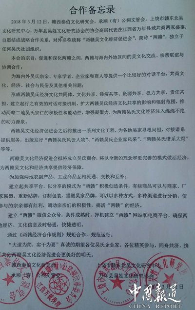 中国报道记者吴蜀丰特约撰稿 吴美福)2018年3月12日,赣西泰伯文化研究会,承顺(宥)公祠文管会,上饶市赣东北吴文化研究中心,万年县吴姓文化研究协会的协会高层代表在江西省万年县城共商两家盛事,自愿结成战略合作关系,对外名称统称“两赣吴文化经济促进会”,简称“两赣”,独立于任何吴氏社团组织。本会的宗旨: 在国家法律法规内展开活动,遵守国家的政策和法令。促进和深化两赣之间,两赣与海内外地区间的吴文化交流、宗亲联谊与协调合作。为海内外吴氏宗亲、专家学者、企业家和商人等提一个比较好的对话平台,共商文化、经济、社会与民俗及其他相关问题。形成两赣吴氏经济文化共同体,文化共享、经济共享、资源共享、权力共享、责任共担,建立起行之有效的对话对接机制,扩大两赣吴氏经济文化共享的影响和辐射范围,推动两赣二地吴氏宗仁的积极性和能动性,增强凝聚力,为两赣吴氏文化经济注入绵绵不绝的动力源泉。两赣吴文化经济促进会之后将推出一系列文化工程,为各地吴家寻根问祖,对接谱系提供服务,出版发行“两赣吴氏风云人物”,”两赣吴氏企业家风采”、“两赣吴氏谱系大纲”等等。两赣吴文化经济促进会拟将成立吴氏商会,将以全新的理念和更完善的模式做活经济,为两赣吴文化和经济共享提供经济保障。
