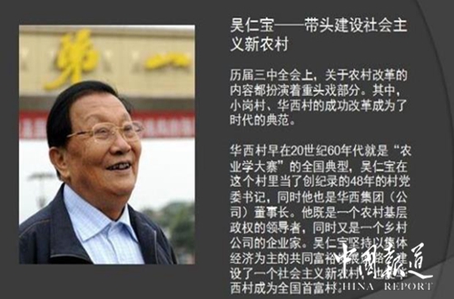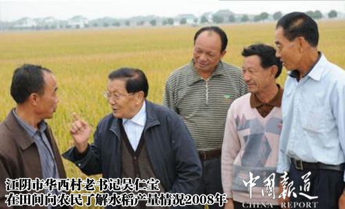 吴仁宝宗贤是“天下第一村”——华西村的带头人,他用他全部的心血、智慧和精力铸就了华西今天的辉煌,让华西成为社会主义新农村建设的标兵和楷模。吴仁宝铸就了中国共产党人卓越的世纪传奇。在充满艰辛的创业历程中,仁宝宗长始终以一个共产党人的博大胸怀、非凡胆略和宏大气魄,倾注了自己全部的智慧、精力和心血,把造福人民作为毕生追求,秉持坚定的理想信念、顽强的拼搏精神、独特的发展思路和高尚的人格力量,团结带领华西人民高举旗帜,艰苦创业,开拓创新,取得了举世瞩目的辉煌成就。华西村被誉为“天下第一村”的富裕村、幸福村、和谐村,成为我国改革开放取得重大成就的生动缩影,成为建设中国特色社会主义新农村的鲜活实践的代表,成为我国建设社会主义新农村一面永不褪色的旗帜;吴仁宝老宗长也成为当代中国亿万农民的智慧象征,成为建设社会主义新农村的杰出典范,成为全国著名的先进典型和中国共产党人的时代楷模。