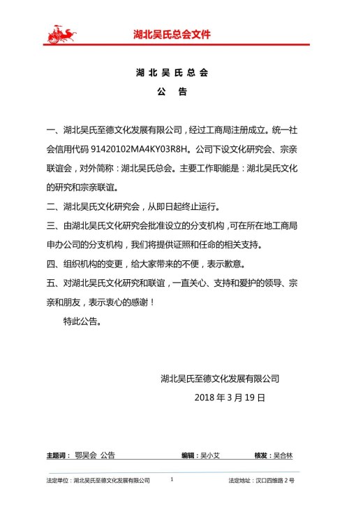 2018年3月18日,湖北吴氏总会召开2018年第一次工作会议,参加会议的有吴合林、吴志刚、吴新国、吴小艾、吴良恕、吴铭、吴先金、吴凤琴,吴德全列席会议。会议由吴合林会长主持。