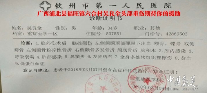 广西浦北县福旺镇六合村吴良全头部重伤期待你的援助