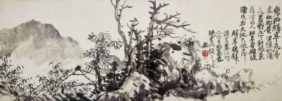 山水卷装池于翌年,后载二十七家之二十八则题记。前二十二则为缶庐师友辈,先后为杨岘 (二则)、万钊、费念慈、周星诒、高邕、凌霞、金尔珍、沈公周、章钰、金尔珍、沈曾植、马一浮、郑孝胥、朱士林、王国维、陈三立、冯幵等二十一家。缶庐殁,其子东迈又延请诸宗元、冒广生、夏敬观、沈剑知、吴湖帆五家题记。后又有藏家属笔者题跋一则,总计二十八则。吴氏将此山水卷装池后,至其下世前三十四年里,多次携卷外出求题,若非自创之妙品,岂能珍重如此。况其时吴昌硕与王一亭尚无交际据考吴、王相识当在1909年3月,即在绘成此卷之十七年后,不存在由王一亭代笔可能。书法家、金石家杨岘在题跋中称:“昌硕仁弟自画山水八纸,装治成卷。癸巳 (1893)秋七月下榻敝斋,出视率题。”高邕的题跋更指出此卷是作于其画室,跋称:“缶庐金石家,五十学山水。昨在李盦中,一挥得八纸。天生横行笔,今古皆不是。闯入大滌堂,吓得石涛死。”又谓:“苍公今年忽画山水,此卷不学石涛而有石涛韵度,展玩数过,乃知此老胸中未易窥测。癸巳十月,高邕题于上海。”证据凿凿,可知吴氏是工于山水的,且具有不凡的水准。附带指出,国内有两家博物馆藏有双胞胎的“听松图”。曾有此是彼非的争辩,而以拙文所刊出之 《听松图》(见刊头图) 及其款题考鉴,可知“双胞胎”者,两无一真,皆为依样仿造的赝品。