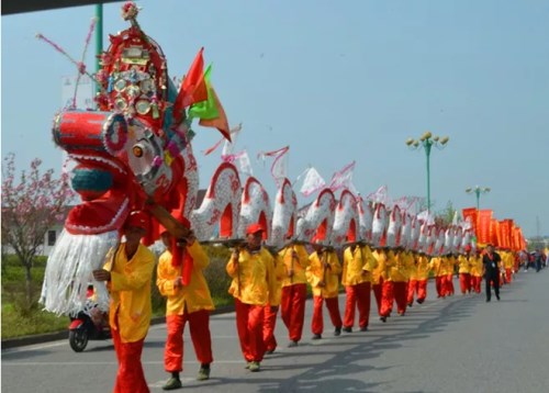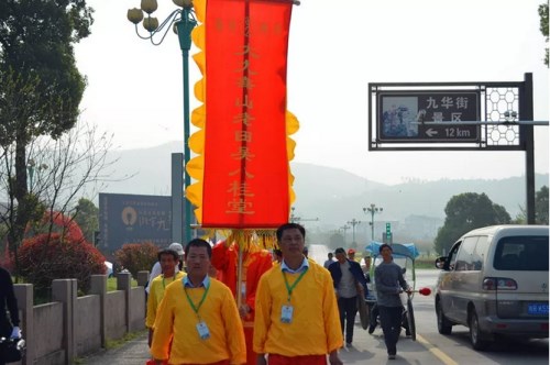 4月1日下午三时许,100余人组成的龙灯、锣鼓、堂旗等队伍,在九华山老田吴氏总会吴海祥的带领下,浩浩荡荡来到大九华山”九华圣境“大牌坊下迎接南京浦吴氏宗亲。